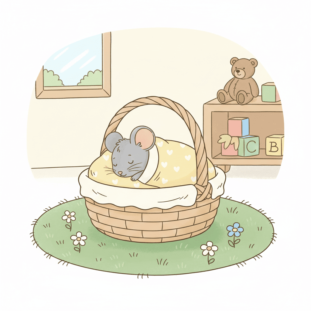 { : « Une illustration mignonne et simple pour les tout-petits. Une petite souris grise dort paisiblement dans un petit panier, enveloppée dans une douce couverture jaune. Couleurs pastel douces, lignes épurées, style professionnel de livre pour enfants, atmosphère joyeuse et calme. » }